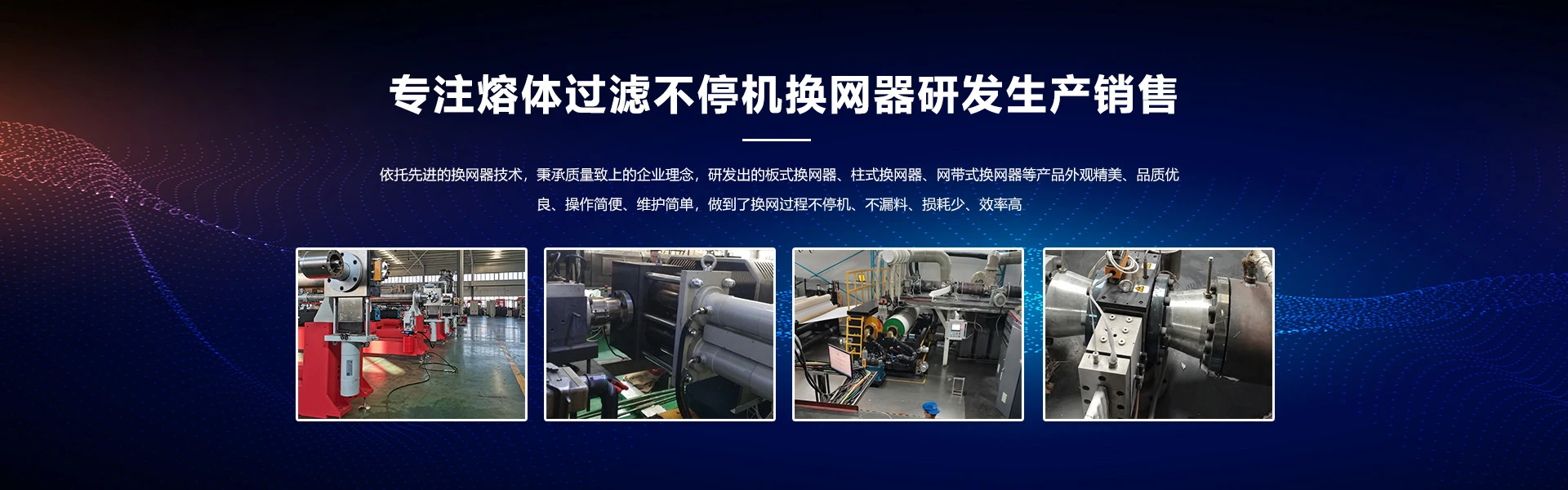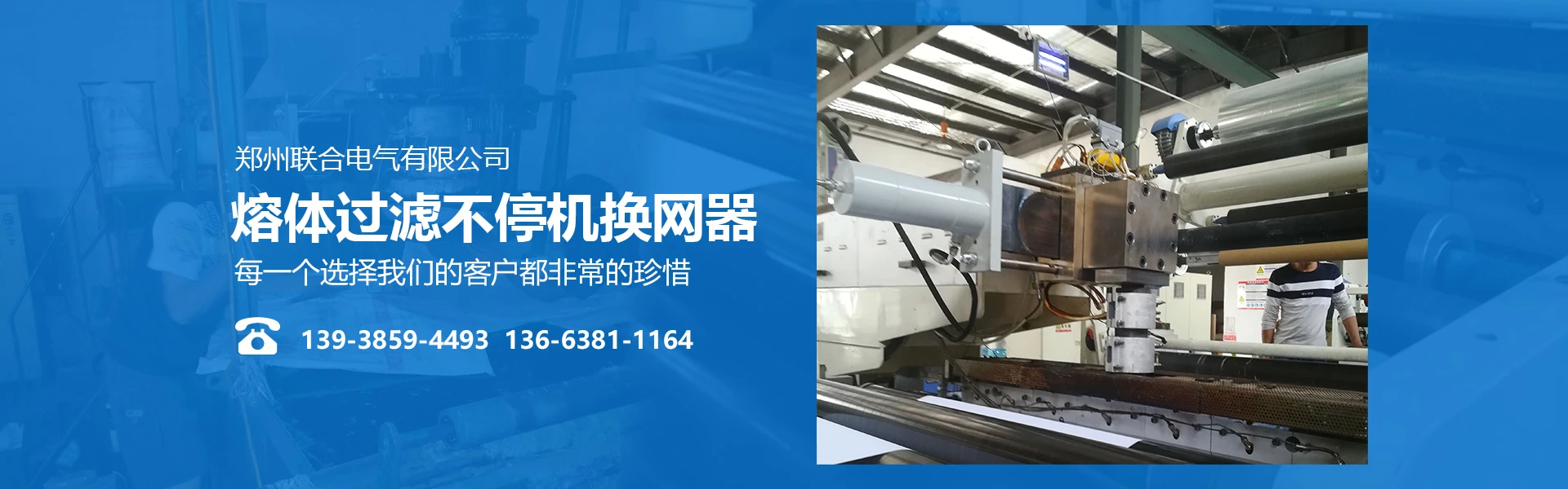 郑州联合电气有限公司专业从事熔体过滤不停机换网器的研发、推广应用及技术服务。公司拥有多年从事不停机换网器设计、生产的专业技术团队。专注于换网器产品的功能实用性和质量稳定性,结合生产过程中熔体的特性,将先进的换网器技术转化为实用、可靠的工业产品。为塑料、橡胶、化纤、胶黏剂、溶胶、涂饰料等各类熔体过滤,提供完善的不停机换网解决方案,使客户及时得到节能环保的换网器产品,取得良好的生产工艺效果。 公司依托先进的换网器技术、质量致上的企业理念,研发出的板式换网器、柱式换网器、网带式换网器等产品外观精美、品质优良、操作简便、维护简单,做到了换网过程不停机、不漏料、损耗少、效率高,是粘流体过滤作业的理想配套产品。同时,针对不同行业、不同介质可量身定做能够实现良好工艺效果的换网器产品。